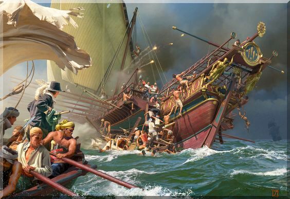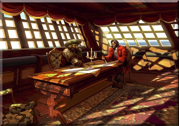 ![]() (Background Music ~ Adrian von Ziegler) ![]() Pirate Ships The single-masted sloop had a bowsprit almost as long as her hull making her perhaps one of the swiftest vessels of her day. If the wind was favorable, a square topsail could be hoisted to give her a top speed that could on occasion exceed eleven knots. The Sloop was a favourable ship for pirates and smugglers alike. This relatively small vessel could carry around 75 pirates and around ten cannons. The Sloop was often the ship of choice for hunting in the shallower channels and sounds. The Schooner which came into widespread use around the last half of the eighteenth century is a little of all of the best features in a pirate ship. Perhaps her greatest virtue lie in her shallow draft. She was favored by pirates of the North American coast and the Caribbean. Fully loaded she was still small enough to navigate the shoal waters and to hide in remote coves. The Schooner could also reach 11 knots in a good wind. Another versatile ship the Brigantine was more of a captain's ship for a pirate. This was generally a 150 ton, 80 foot vessel that could carry around 100 pirates mounting over 10 cannons with a cargo space about twice as big as the sloop. She had two masts. Her main sail could be fitted with either square sails that were best in quartering wind, or fore-and-aft sails for sailing windward. This larger ship was the clear choice for battle or combat rather than the quick, hit and run type piracy tactics that were practiced with the smaller sloops and schooners. It was also rugged enough to cross the Atlantic ocean, and faired better in harsh sea conditions. Also keep in mind that pirates could not build a ship to order like the merchants and military did. They had to be opportunists and having looted a ship, the pirates would either burn the vessel, let it go on it's way, set it adrift, or take the ship over for their own use. Most pirate ships were no more then captured vessels taken as prizes and then altered to suit the pirates needs. The large three-masted squarerigger type ships could be fitted with well over twenty cannon plus many swivel guns and a crew of around two hundred or more men. She could make a formidable adversary and an excellent flagship for a large group of pirates despite her lack of agility. Many ships would probably have surrendered to her without a shot fired if they were not fast enough to out-sail her. Besides being greatly feared and comparable to a Navy Frigate, she had a reputation for seaworthiness on long voyages and a cargo space about twice as large as that of the brigantine. One of the most impressive aspects of some of the early eighteenth century pirates is the enormous voyages which they made in search of riches. They sailed the North American coast from Newfoundland to the Caribbean. They crossed the Atlantic to the Guinea coast of Africa. And they rounded the Cape of Good Hope to Madagascar in order to plunder the ships in the Indian Ocean. The Barbary corsairs of the Mediterranean mainly used oar powered galleys rowed by slaves. These were long rather slender craft which were renowned for their speed, and sailing ships traveling in the calm winds of the Mediterranean were at their mercy. Their oars made them very quick, enabling them to maneuver quite easily and to come alongside an intended victim. When the winds picked up the corsairs hoisted a large lateen sail on a single mast amidships. The galleys were armed with one or more big guns at the bow, and several swivel guns were also mounted along the side rails. But like with most pirate ships their main weapon was in their fighting crews, who could number over one hundred men on a large galley. These men would quickly swarm aboard a ship and sweep aside all opposition. These corsairs were not generally involved in piracy for gold or silver. They were trying to capture people, who they could hold for ransom, use as oarsmen on their galleys, or just sell as slaves. ![]() Of the many types of ships used in the great age of sail. Most of them are distinguished by their rigging, hull, keel, or number and configuration of masts. Designs would usually be modified over the course of time with lessons gained from use. The same ship type could vary in how it was built by country. Pirates sailed aboard almost all of the ship types listed below. Various small sailboats and fishing boats were not included. ![]() Ship Classes BARK (BARQUE) Before the 1700's the name was applied to any small vessel. Later it applied to a small ship having three masts. The first two being square-rigged, and the third ( aft mast ) being fore-and-aft rigged. Fast ship with shallow draft. Favorite of Caribbean pirates. Crew around max. of 90. BRIG Very popular in the 18th and early 19th centuries. A brig is a sailing vessel with two square-rigged masts. To improve maneuverability, the aft mast carries a small gaff rigged fore-and-aft sail. The brig actually developed as a variant of the brigantine. Re-rigging a brigantine with two square-rigged masts instead of one gave it greater sailing power, and was also easier for the crew to manage. During the Age of Sail, brigs were seen as fast and maneuverable and were used as both naval warships and merchant vessels. When used as small warships, they carryed about 10 to 18 guns. Due to their speed and maneuverability they were also popular among pirates, although they were rare among American and Caribbean pirates. BRIGANTINE Originally the brigantine was a sail and oar driven small warship used in the Mediterranean in the 13th century. It was lateen rigged on two masts and had between eight and twelve oars on each side. Its speed, maneuverability and ease of handling made it a favorite of the Mediterranean pirates. Its name is derived from the Italian word brigantino, meaning brigand. By the 17th century the term was adapted by Atlantic maritime nations. The word eventually was split into brig and brigantines. Each word m